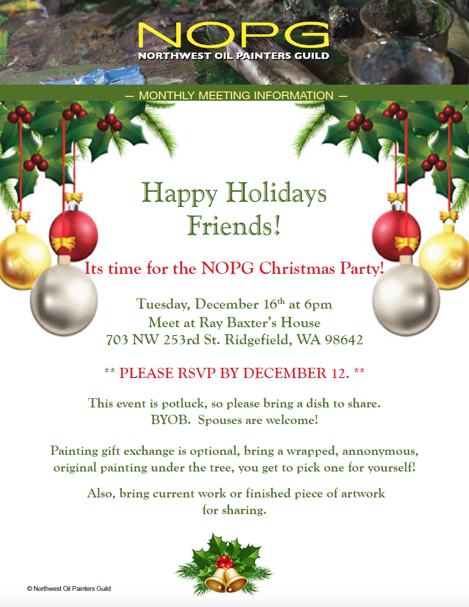 The Northwest Oil Painters Guild (NOPG) was founded in August 2002. We meet monthly in Vancouver, WA. We are a group of oil painters who share a passion for improving our abilities with this historic medium. One of our primary purposes is to support and encourage our member artists.